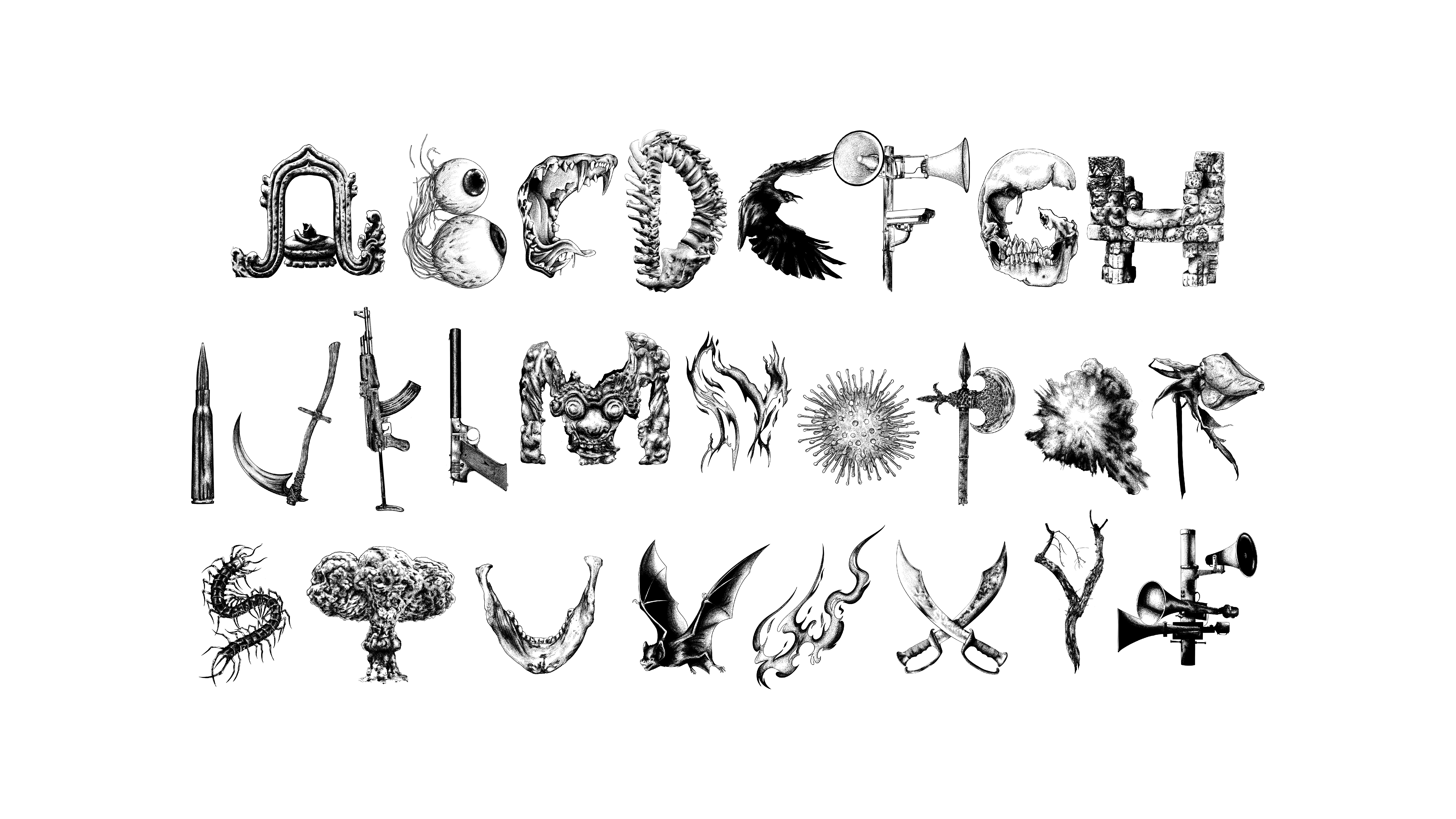 This Experimental typography reflects an alphabet of a fractured world built from violence, control, and environmental ruin.